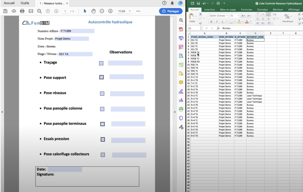 Grâce à l'intégration avec Excel et notre outil de suivi de chantier FunBIM, créez et pré-remplissez vos formulaires d'autocontrôle en un clin d'œil!